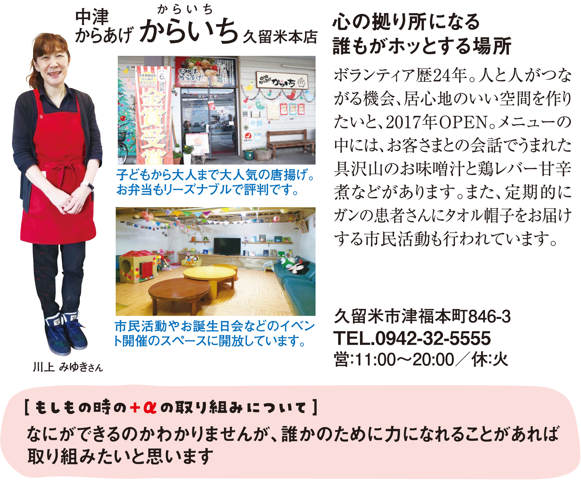 ボランティア歴24年。人と人がつながる機会、居心地のいい空間を作りたいと、2017年OPEN。メニューの中には、お客様との会話でうまれた具沢山のお味噌汁と鶏レバー甘辛煮などがあります。また、定期的にガンの患者さんにタオル帽子をお届けする市民活動も行われています。