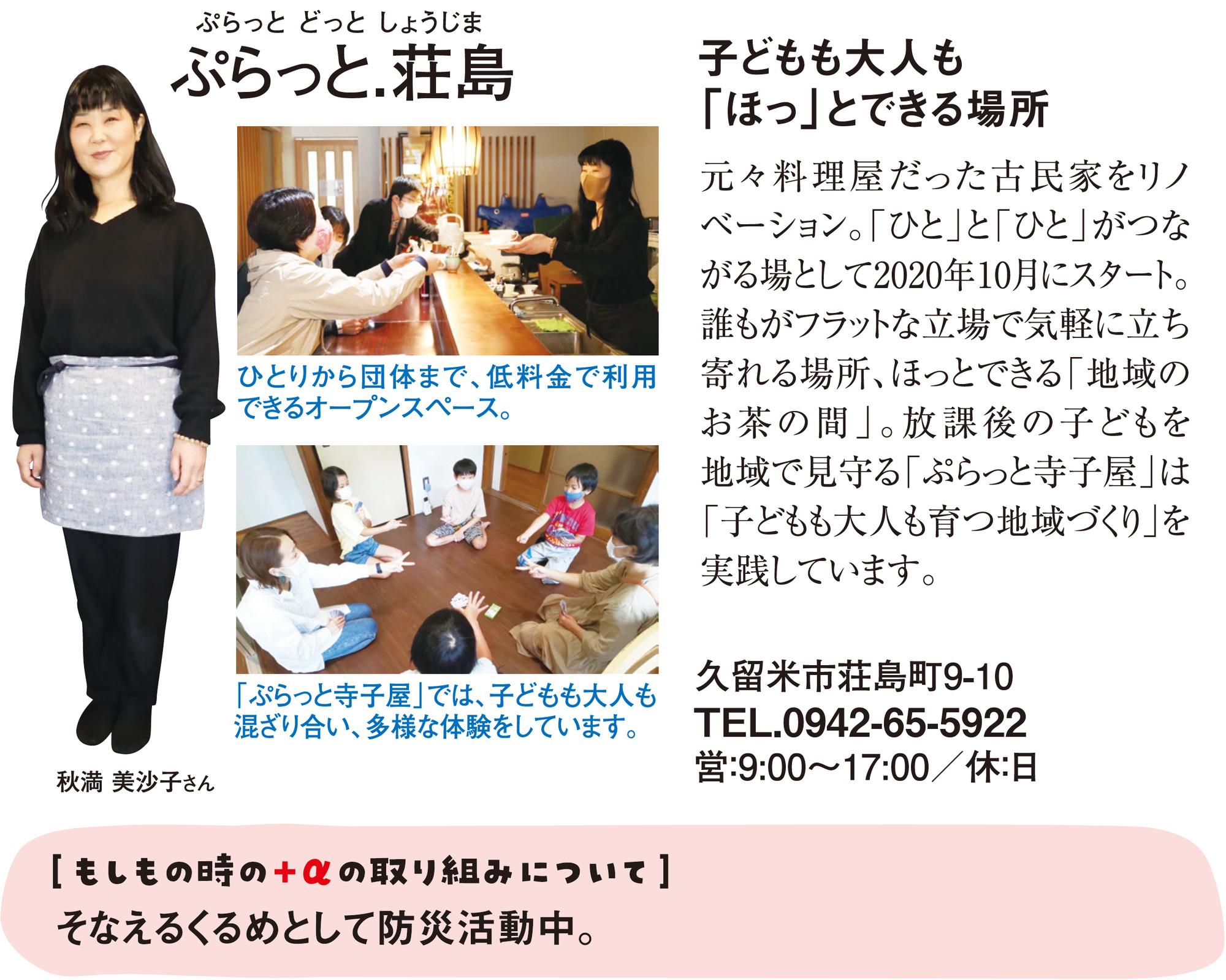元々料理屋だった古民家をリノベーション。「ひと」と「ひと」がつながる場として2020年10月にスタート。誰もがフラットな立場で気軽に立ち寄れる場所、ほっとできる「地域のお茶の間」。放課後の子どもを地域で見守る「ぷらっと寺子屋」は「子どもも大人も育つ地域作り」を実践しています。